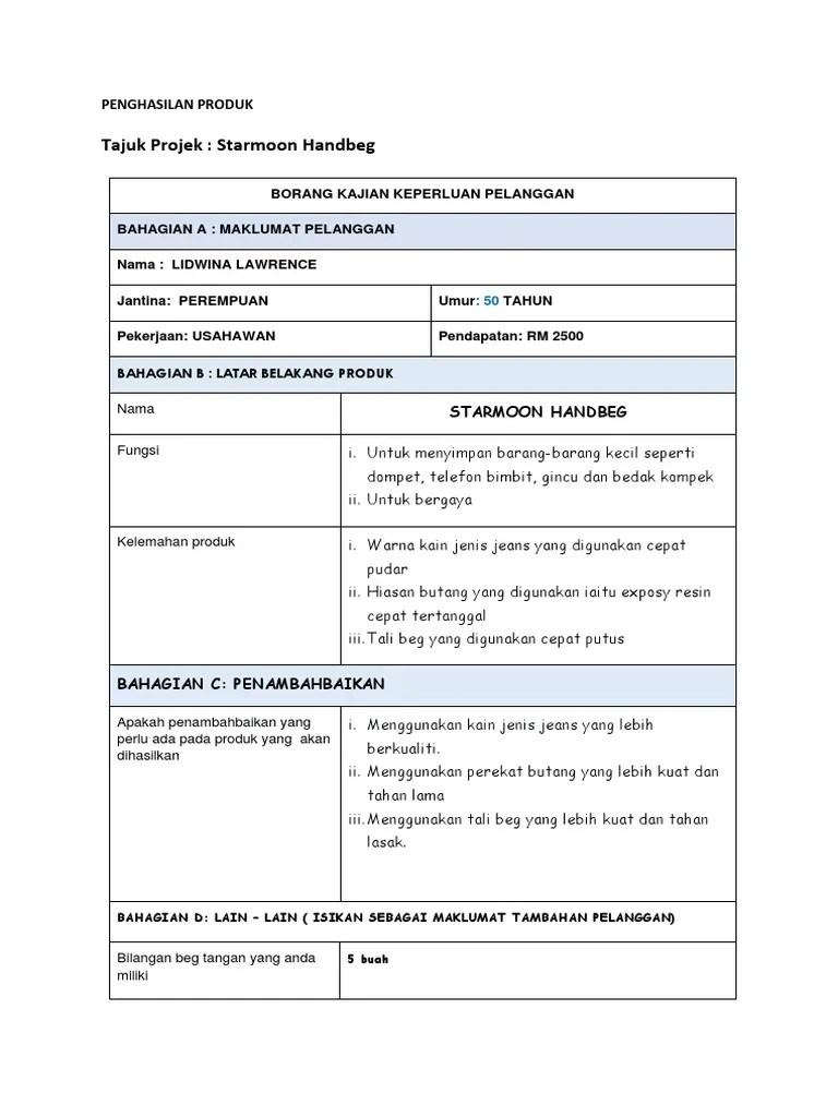 Abstrakproduk beg jeans serbaguna ini dihasilkan dengan tujuan untuk membawa. Contoh borang 1 borang kajian keperluan pelanggan a. Berdasarkan kajian keperluan pelanggan, di depad. Diperbuat daripada bahan kain / fabrik jenis jeans, sejenis. Contoh borang kajian keperluan pelanggan rbt . Kandunganisi kandunganhalaman1.0pengenalan1.1kajian keperluan pelanggan1.2penyelesaian masalah inventif1.3borang projek brief1.4aplikasi projek brief dalam .